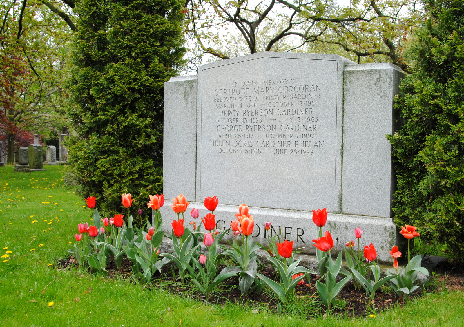 Gardiner and Ryerson are big names in Toronto, but I can't find any information to see if this grave in the Mount Pleasant cemetery holds any of the actual bigwigs. The large size of the stone and the care taken with the tulips would tend to make me think they are attached to one of the important families. In any case, I find this memorial stone and the flowers simply lovely.